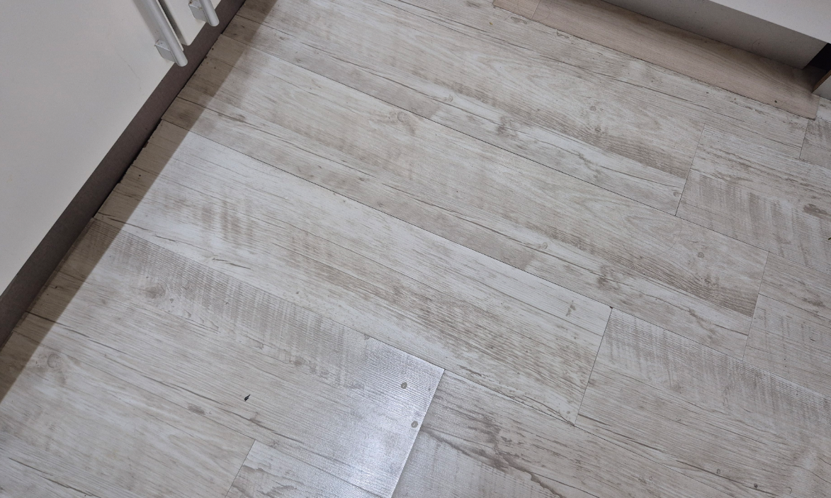 - 손상 원인: 주방 싱크대 앞 강화마루에 물이 유입되어 표면이 부풀어 오르거나 변색됨.