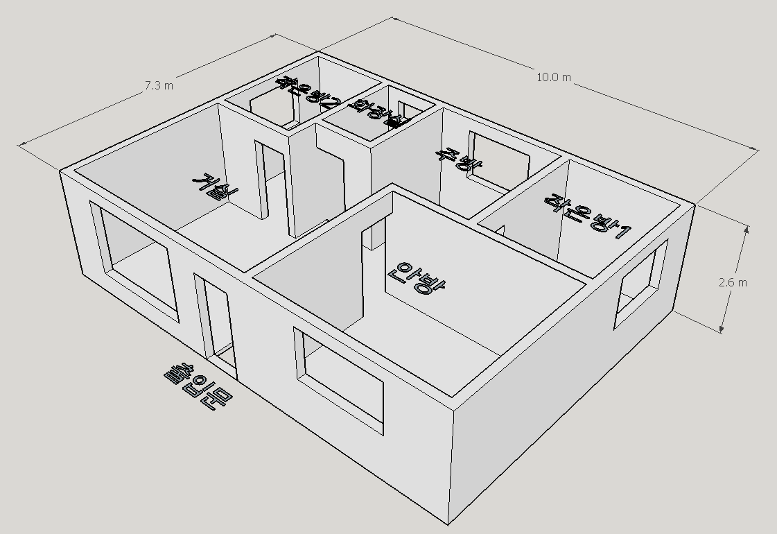 지난 3월 10일에 올린 복합 인테리어를 했다. 내부 사진만으로는 집 전체를 설명하기에 뭔가 부족한 면이 많다. 개략적으로 이해하는데 스케치업만 한 것이 없는 것 같다. 현관문, 방문, 창문 등은 모두 생략하고 전체적인 집 구조를 보여주고 있다. 거실, 주방, 안방, 작은방 1,2, 화장실이 있는 방이다.