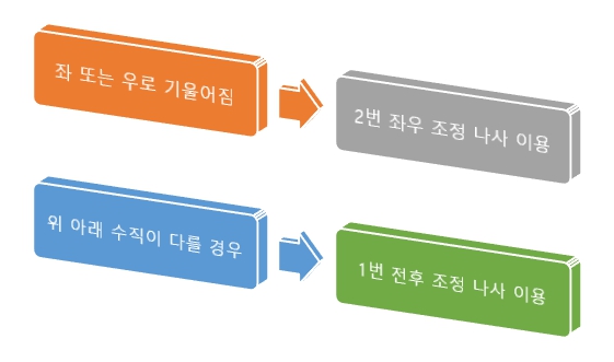 경첩을 고정한 후 문을 여닫으며 문의 수평과 수직 상태를 확인해야 합니다. 보조적으로 수평자를 이용해서 재확인을 합니다. 문을 닫았을 때 좌로 또는 우로 기울어졌으면 2번 좌우 조정 나사로 움직여 맞춥니다. 좌문이 좌로 기울어졌으면 2번 좌우 조정 나사를 반시계 방향으로 풀어 주고, 우로 기울어졌으면 시계방향 쪼여줍니다. 우문인 경우 좌로 기울어졌으면 2번 좌우 조정 나사를 시계 방향으로 쪼여주고, 우로 기울어졌으면 반시계방향으로 풀어줍니다.