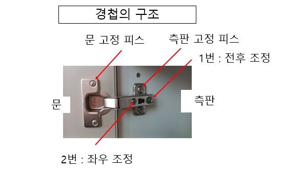 경첩을 고정한 후 문을 여닫으며 문의 수평과 수직 상태를 확인해야 합니다. 보조적으로 수평자를 이용해서 재확인을 합니다. 문을 닫았을 때 좌로 또는 우로 기울어졌으면 2번 좌우 조정 나사로 움직여 맞춥니다. 좌문이 좌로 기울어졌으면 2번 좌우 조정 나사를 반시계 방향으로 풀어 주고, 우로 기울어졌으면 시계방향 쪼여줍니다. 우문인 경우 좌로 기울어졌으면 2번 좌우 조정 나사를 시계 방향으로 쪼여주고, 우로 기울어졌으면 반시계방향으로 풀어줍니다.