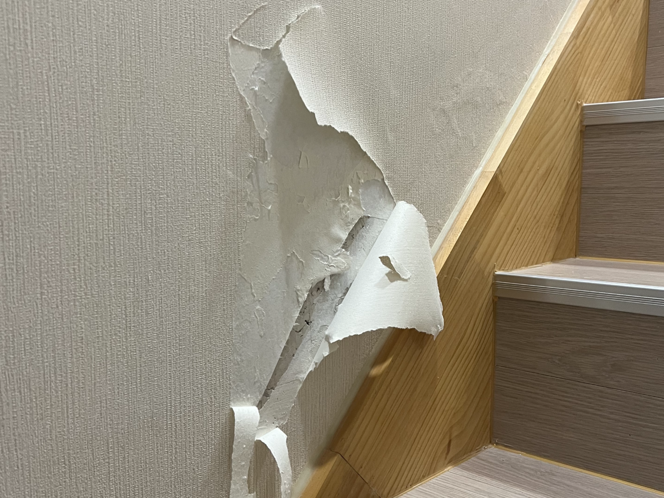 애완동물을 실내 같은 공간에서 생활하며 생기는 벽지의 손상을 말한다. 주로 물어뜯어 그 손상된 벽지의 존재를 찾을 수 없어 부분 보수가 되지 않는 경우가 많다. 보수방법은 폭갈이 또는 면갈이를 해야 한다.