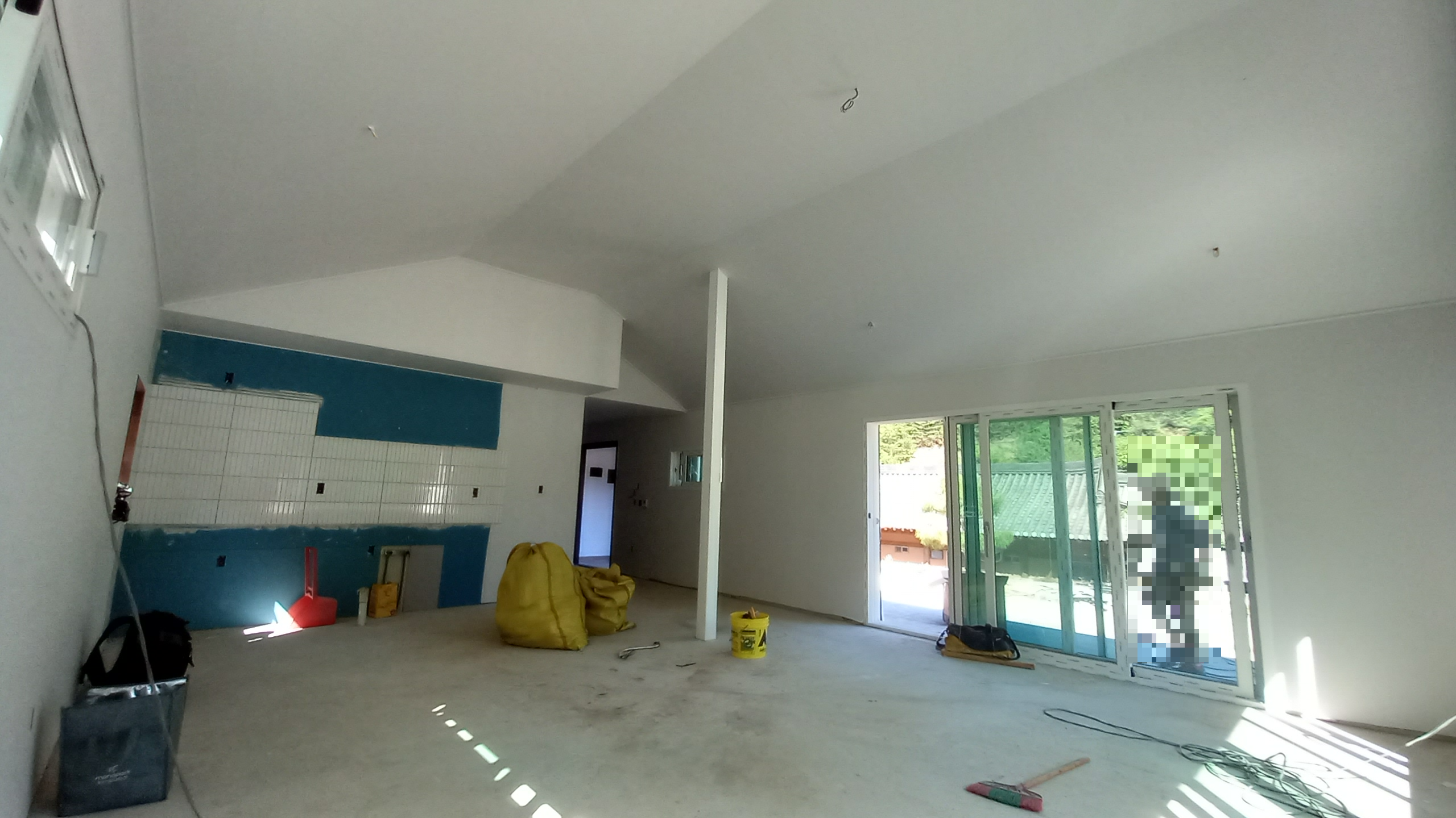여기도 비티아시바를 놓고 해야 가능한 높이이다. 3폭만 붙이면 거실 천장의 2/3는 끝나는 것이다. 비티비계를 이용한 부분은 한 부분만 남는 것이고, 그 부분이 마무리되면 비티비계는 철거를 할 것이다. 거실의 천장이 마무리가 되면 점심을 먹을러 갈 것이고, 오후엔 거실 나머지와 방 2개와 옷방, 팬트리, 현관, 보일러실을 마무리하면 끝나는 것이다. 많은 것 같지만 천고높이가 일반적이라 거실처럼 비티비계를 옮기는 일은 없었다.