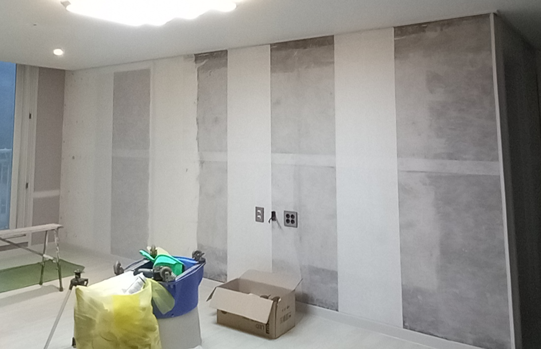이 시공방법은 가장자리 외에는 떠 있기 때문에 여러 장단점이 있습니다. 이 시공방법은 부직포와 운용지를 주로 이용합니다. 먼저 부직포를 가로로 길게 시공을 한 후, 벽지 이음매 자리에 운용지를 붙여줍니다. 부직포 시공과 운용지 시공을 가각 1회씩 실시합니다. 가장자리 시공은 부직포와 높은 점도의 본드를 사용합니다. 건조가 되면 부직포와 벽은 하나가 됩니다. 본드칠 부분은 벽에 코팅이 돼, 오염물질 전이를 차단시켜 주는 역할을 합니다.