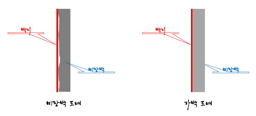 이런 벽에 밀착 도배로 할 경우 그 벽면의 모양 생김새가 드러나며, 미장벽과 가벽의 차이를 그대로 느낄 수 있습니다. 보안방법으로는 가장자리만 잡아주고 그 외는 공간을 확보해 주는 띄움 시공입니다. 고급도배에 해당하는 것입니다. 가운데 부분의 벽지는 벽과 직접 닿지 않아 벽으로부터 오염을 예방해 줄 수 있습니다.