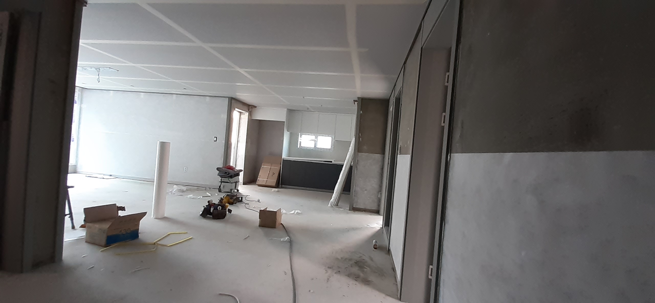에코텍스 시공할 때 울지않게 잘만 시공해준다면 정배할 때도 전혀 울지 않는다는 것입니다. 일반 텍스초배하면서 아쉬웠던 부분들이 이제 말끔하게 해결이 된 것같습니다. 정배솔로 싹싹 쓸어가며 바람을 빼주며 벽지를 펴줍니다. 그런데도 불구하고 텍스 초배지가 꼬이거나 울지 않는다는 건 바로 에코텍스만의 장점이라고 할 수 있습니다. 정배하면서 묻은 풀과 실리콘들은 바로바로 닦아주어야 합니다. 두번째 장은 첫번째 장을 기준점으로 하여 실크벽지를 맞댐시공으로 하여 붙입니다. 이음매 부분을 물걸레로 물을 묻힌 후 주걱으로 풀을 빼줍니다. 이후 롤러를 이용해 이음매 부분의 틈새가 없게 하거나 볼록 올라온 부분을 평평하게 맞춰줍니다. 그 후 물걸레로 이음매 부분을 깨끗이 닦아 줍니다. 그 후 시작부분과 몰딩부분등 도배면이 아닌 곳은 칼받이을 이용해서 칼질을 해주니다. 이 과정에서 나온 실리콘은 잘 닦아주며, 물걸레도 잘 빨아 재사용합니다. 세번째 그 이상의 벽지는 전과 동일 방법으로 상단에서 약 2/3까지 붙인후 옆으로 이동을 합니다.