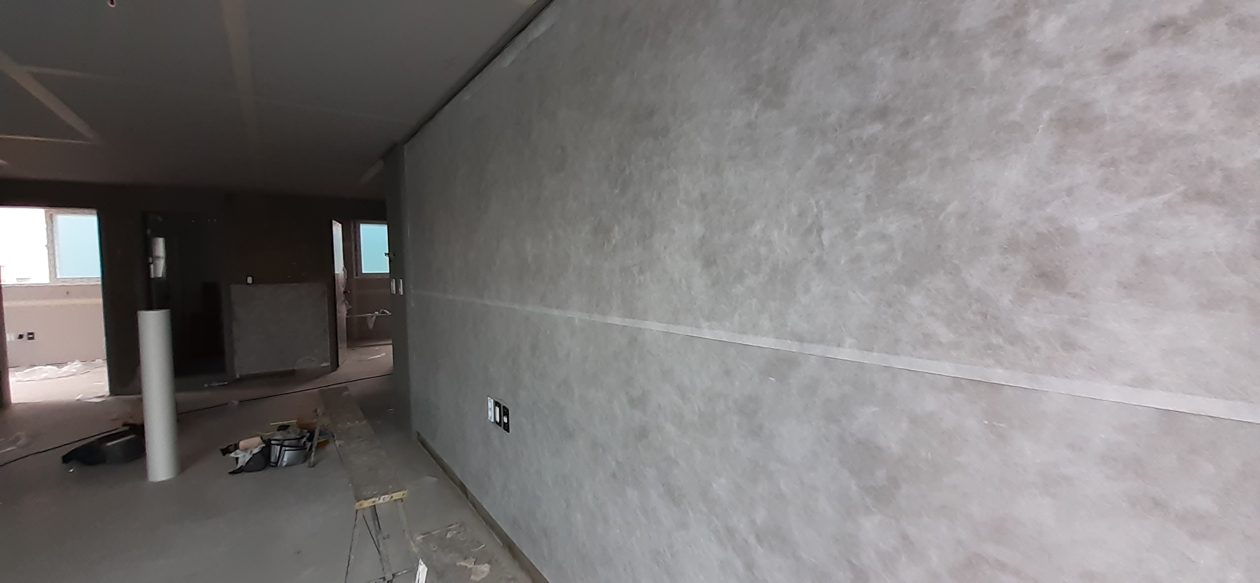 처음 시작점 위 부분을 한 두뼘 정도만 붙힌후 반대 방향으로 정배솔과 손으로 밀고 나갑니다. 콘센트, 스위치와 같은 장애물 자리는 에코텍스 시공할 때 본드풀을 넣어주는 것보다 정배할 때 넣어주는 것이 벽지가 울지 않고 도배가 잘 됩니다. 가장자리가 울게될 경우 손보다는 주걱(본드헤라)으로 밀어서 펴주시면 잘 펴집니다. 시공한 하단 에코텍스의 위 부분 안 쪽에 적정량의 본드를 넣어 주걱으로 눌러 벽에 붙게끔 하는 것도 잊지 않고 하는 것도 중요합니다. 정배할 때 울지 않아 벽지 바르는 것이 정말 편합니다.