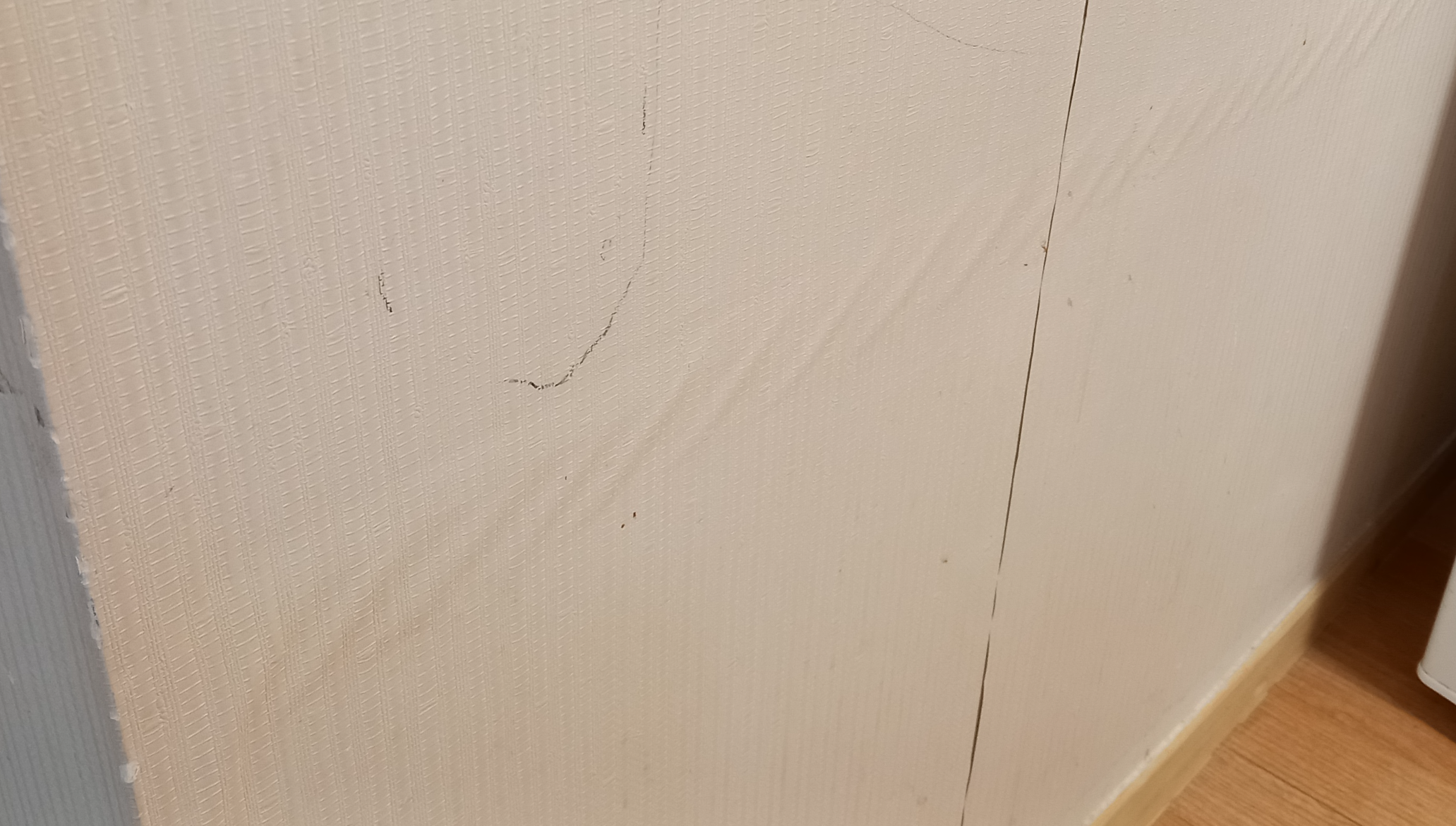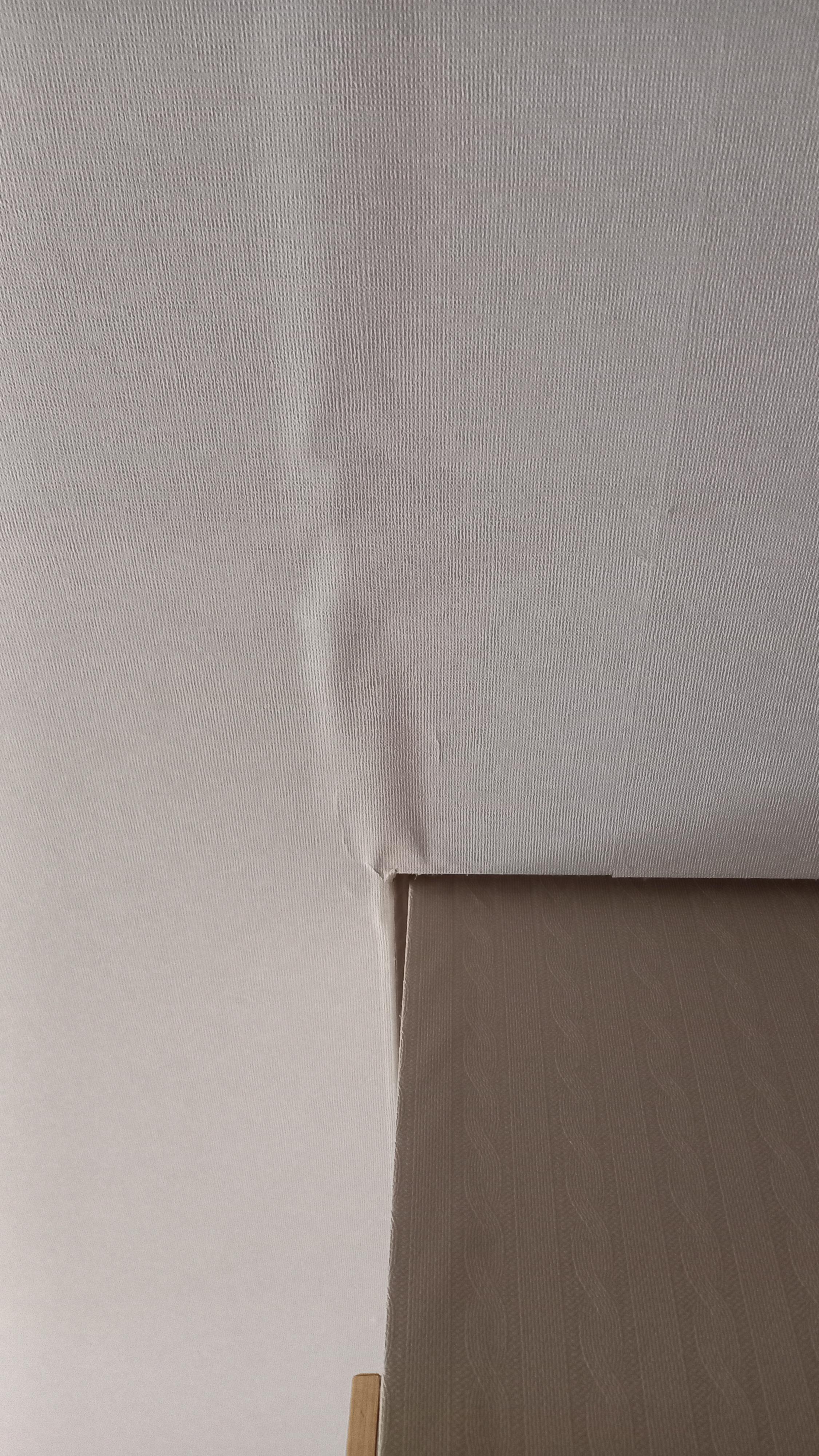 아래 그림과 같은 현상이 발생할 수도 있지만, 그 원인이 도배 기초 작업 불량으로만 볼 수 없습니다. 그런 현상이 발생한 벽면을 손으로 두들겨 보세요. 그 마감재는 석고보드 또는 MDF와 같은 목공 마감재입니다. 그 이유는 네바리[틈박이 초배지] 기초 작업을 하는 부분 즉 석고보드 또는 MDF 이음매 부분입니다. 목공작업의 마감자재의 미세한 움직임에 의해 네바리와 함께 마감한 벽지가 같이 밀리거나 넓어지거나, 한쪽으로 틀어질 수 있기 때문입니다. 미장으로 마감한 면의 크랙으로 인한 이런 현상은 찾기가 매우 어렵습니다.