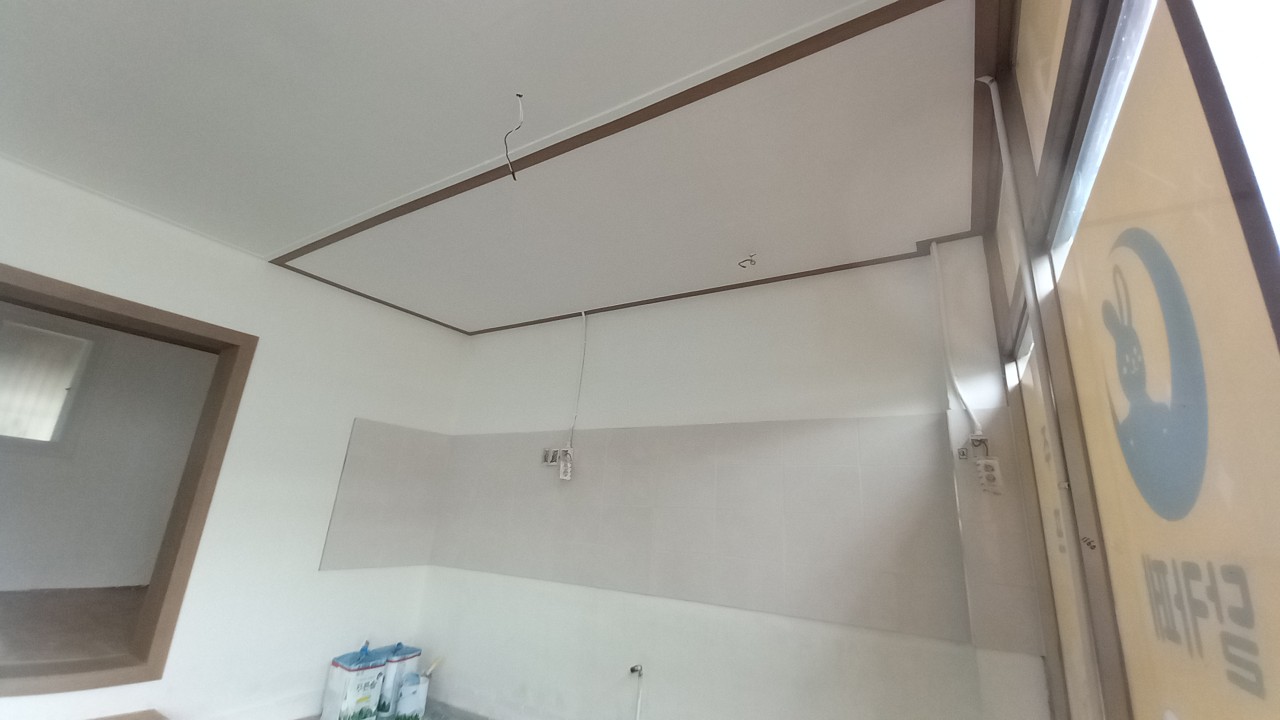 메인 홀의 주방자리 반자가 없어 천장이 보입니다. 옆에 설치된 반자 높이와 동일하게 설치합니다. 반자틀을 만들어 합판으로 반자널로 사용합니다. 평몰딩 시공을 합니다. 최종마감은 도배입니다.
