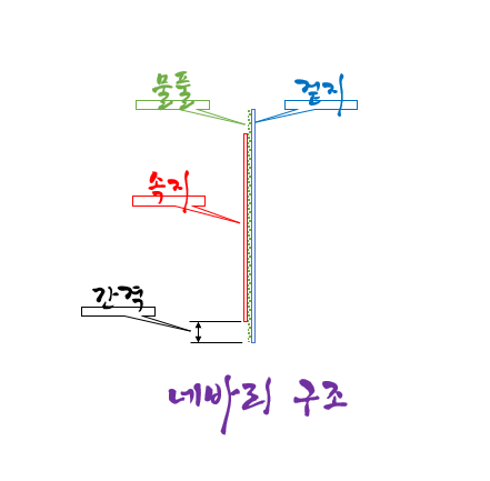 풀 다음으로 많이 사용하는 부자재이다. 틈(크랙), 이음매등이 있는 곳에 모두 사용해줘야 한다. 예를 들면 석고보드 또는 합판의 이음매, 갈라진 벽면 틈(크랙), 합지벽지로 덧빵 시공할 때의 이음매 등이다. 네바리의 구조는 다음과 같다. 초배지 2장으로 겉지와 속지로 구분이 되고 그사이에 물풀이 존재한다. 물풀이 존재하는 양쪽 간격만큼만 붙인다. 그 사이는 물풀이 없어 접착력은 없다. 접찹력이 없는 부분에 틈(크랙), 이음매가 들어올 수 있게 만들어야 한다. 그렇지 못할 경우 여러 번 시공해도 된다. 물리적인 두께 차가 발생함므로 그 단차가 생기지 않게 정배솔로 마무리 솔질을 해야 한다.
