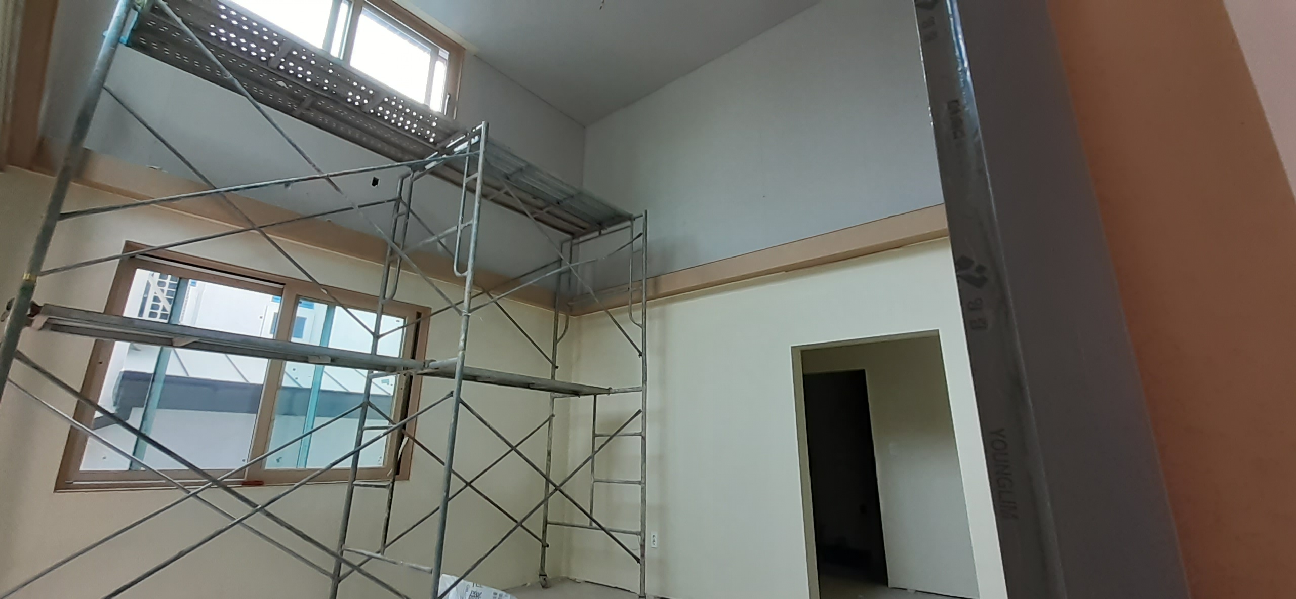 복층형 이상인 벽과 천정 또한 기존 발판으로 될 일이 아닙니다. 비계 시스템 설치는 기본입니다. 비계 시스템 위의 작업자의 안전을 위해 소통이 잘 될 수 있게 확인 절차를 강화해야 안전한 작업 진행이 됩니다. 사다리 또는 비계 시스템 위의 작업자 말에 따라 2인 1조, 3인 1조의 움직이어야 합니다. 발 한번 잘못 디디면 곧 사고로 이어질 수 있으므로, 불필요한 말이나 행동은 각별히 조심해야 합니다.