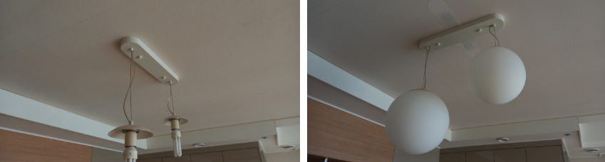 아래 그림은 식탁등입니다. 식탁과 방향이 엊갈려 있어 위치와 방향을 바꾸고자 합니다. 뚜껑을 열지 않고, 위치와 방향 변경 가능하다는 것은 섣부른 판단입니다. 뚜껑을 열면 여러 변수들이 보입니다. 먼저 브래킷 고정 상태을 파악합니다. 전선출구 위치도 함께 파악하는 것도 잊지 말아야 합니다. 가장 중요한 것은 기존 벽지 종류와 자투리 벽지를 찾아내야 보수작업을 할 수 있습니다.