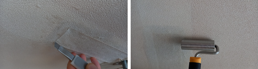 노바시가 충분히 된 자투리 벽지와 부분 보수할 위치에 문방구용 풀 또는 목공용 본드를 충분히 바라준다. 접착제를 도포한 벽지도 접착성분이 퍼질 시간을 줍니다. 이 경우에는 약 5분 정도 기다린 후 보수한 부분에 칼질할 수 있게 겹쳐 붙입니다. 겹친 부분은 두 장이 모두 칼에 의해 잘릴 수 있게 칼 깊이 조절이 필수입니다. 칼집 먹은 부분의 벽지는 제거하여 한 장처럼 맞댐 시킬 수 있습니다. 맞댐 시킬 후 롤러로 물 질러줍니다.