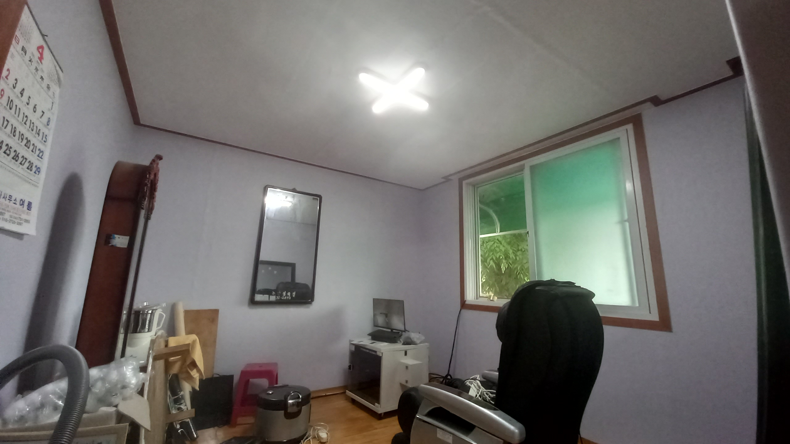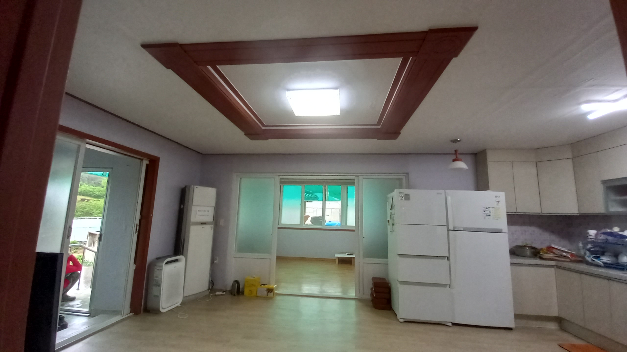 마을회관의 구조는 거실과 주방이 있으며, 거실 양옆으로 방이 하나씩 있습니다. 화장실은 각 방에 한 개씩 있습니다. 거실과 주방, 방 2개 모두 천장과 벽을 일반 도배 공법으로 시공을 했습니다. 일반도배공법은 박리 작업은 벽지가 떠있는 곳만 제거합니다. 제거된 부분에 단차를 없애기 위해 네바리로 보수 초배를 합니다. 또한 합지벽지로 이음매 부분도 네바리로 보수 초배를 합니다. 이런 작업을 한 후 정배로 마무리를 합니다. 정배를 하면 도배는 마무리되었다고 합니다. 이것은 잘못된 생각입니다. 벽지가 건조되어야 도배는 마무리되는 겁니다. 잘못된 건조 방법이 도배 하자를 야기하기 때문입니다. 건조하는 방법은 창문과 방문을 닫고 자연 건조가 되기를 기다리는 겁니다. 풀 먹은 벽지는 건조되면서 습기를 배출하므로 습기가 빠져나갈 정도의 좁은 틈새 정도를 만들어 줘야 합니다. 선풍기, 드라이어등을 이용한 강제 건조는 안됩니다. 적정 온도이상을 유지해야 합니다.