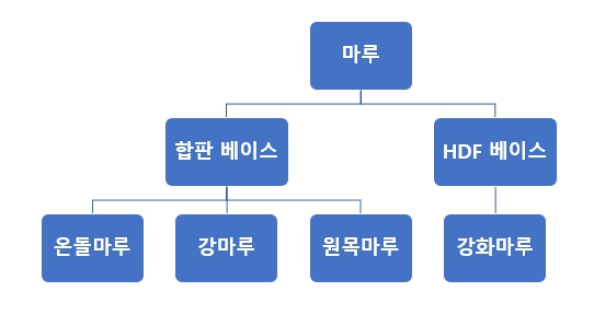 마루는 온돌마루(합판마무), 강마루, 원목마루, 강화마루로 나누어 집니다. 구조적으로 온돌마루, 강마루, 원목마루는 같은 합판을 베이스로 사용하고 있습니다. 그 합판 위에 어떤 것을 올리느냐에 따라 세부적으로 나누어지는 겁니다. 나무를 아주 얇게 켜 붙일 것을 온돌마루, 정밀화된 인쇄면을 덮어둔 것을 강마루, 원목을 얇게 켜 올린 것을 원목마루라고 합니다. 가장 오래된 마루는 20년 가까이 사용된 온돌마루입니다.