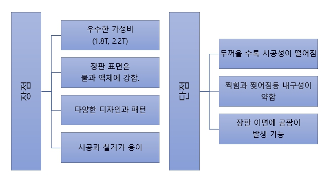 일반적인 두께인 1.8T, 2.2T의 장판보다는 상대적으로 가격이 비쌉니다. 실제 원목을 그대로 재현하기가 어렵지만 질감 및 텍스처 구현 등의 효과를 극대화시키는 것이 가능합니다. 표면 강도가 높아졌어도 찍힘이나 흠집은 생길 수 있습니다. 찍힘이나 흠집에 의한 손상 부분이 작은 경우, 부분 보수는 가능합니다. 반면 손상 부분이 커 쪽갈이를 할 경우에는 난도가 높은 작업일 될 수도 있습니다.