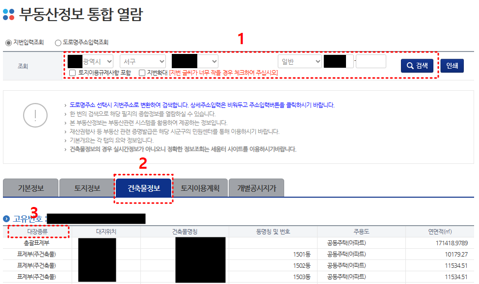 4. 원하는 지역의 아파트를 찾아 들어갑니다(1번). 검색 후 건축물정보(2번)를 클릭합니다. 3번 대장종류 중 내가 거주하는 동에 해당하는 표제부를 클릭합니다.