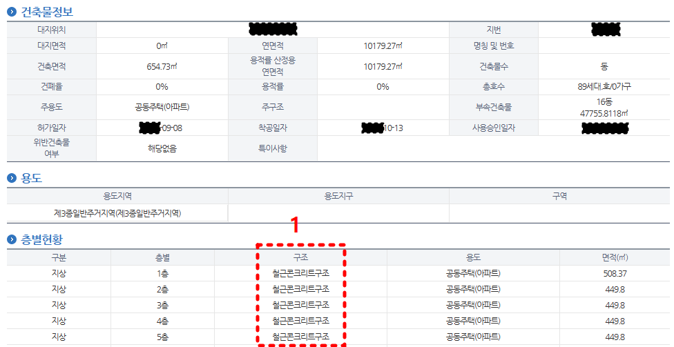 층별 현황에서 1번 상황으로 어떤 구조인지 확인할 수 있습니다. 「철근콘크리트구조·철근콘크리트 벽식 구조·평슬래스·내력벽식」 등으로 표시돼 있다면 벽식 구조입니다. 무량판 구조와 기둥식은 「철골철근콘크리트」라고 표시됩니다.