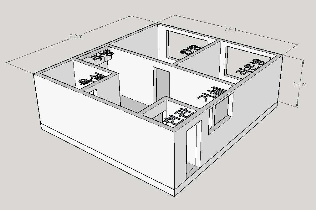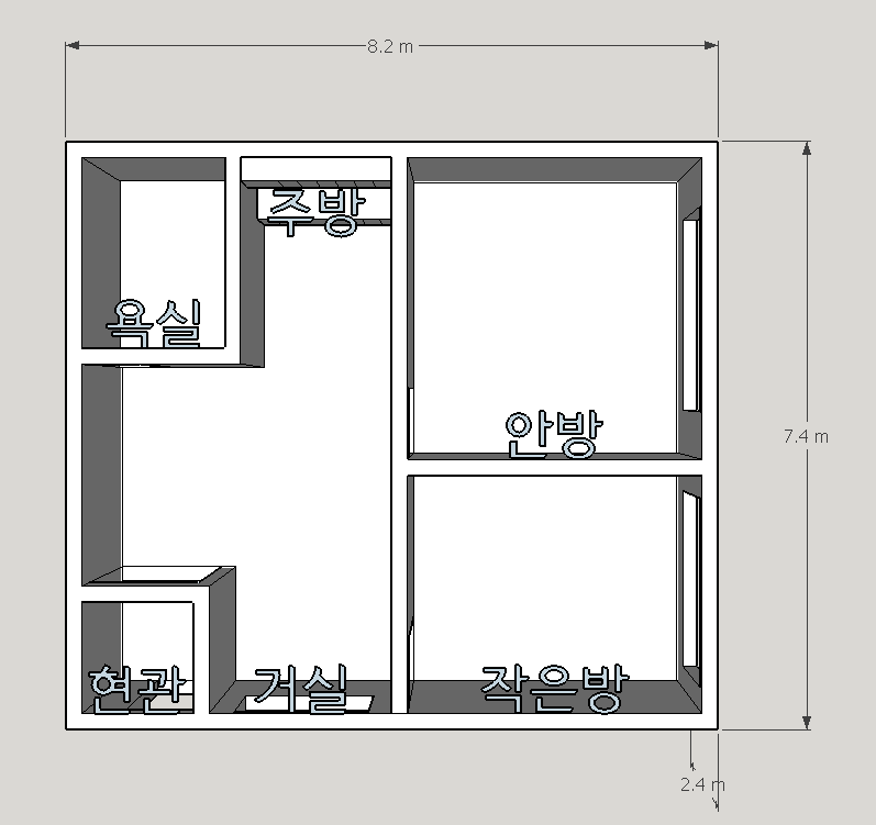위 레이아웃은 실제 바닥몰딩을 시공한 현장입니다. 그림과 같이 직사각형의 모양에 방이 두 개, 욕실은 한 개, 거실, 주방, 현관등으로 구성된 장소입니다. 바닥몰딩이 시공되는 곳은 안방과 작은방, 거실, 주방입니다. 욕실과 현관은 시공을 하지 않습니다. 그러나 의뢰인의 요구에 따라 현관은 시공될 수도 있습니다. 물을 많이 사용하는 욕실에는 바닥몰딩을 사용하는 것은 적합하지 않습니다.