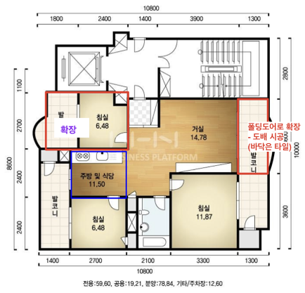 - 확장 구역: 입구방, 거실 발코니 (도배 시공)