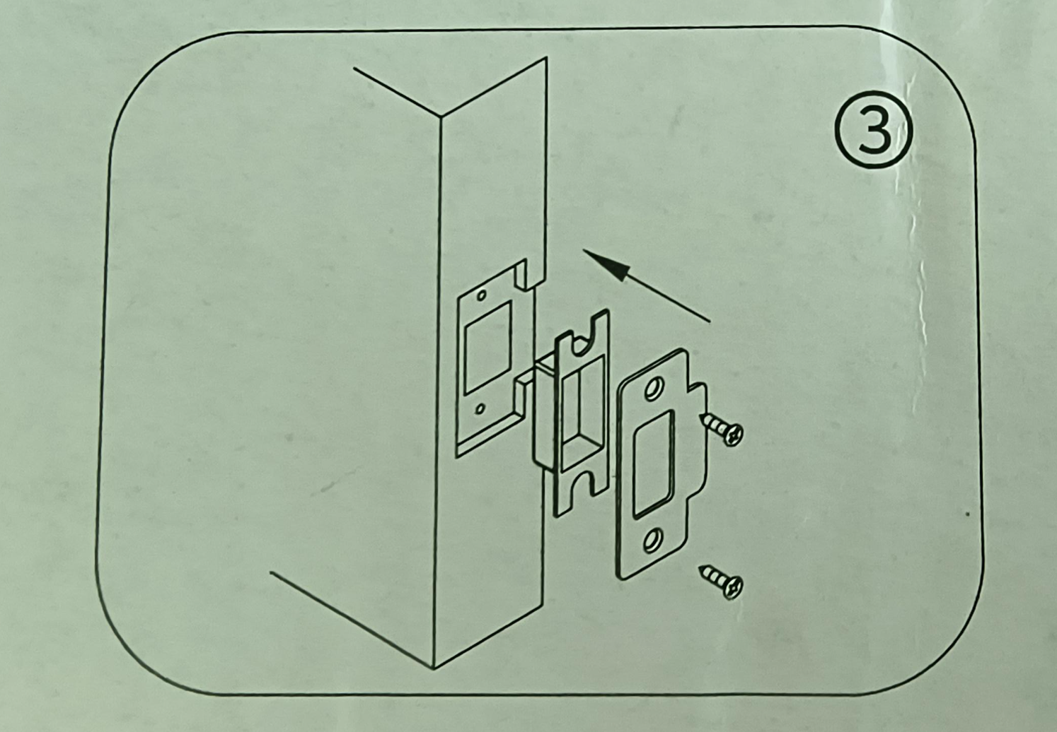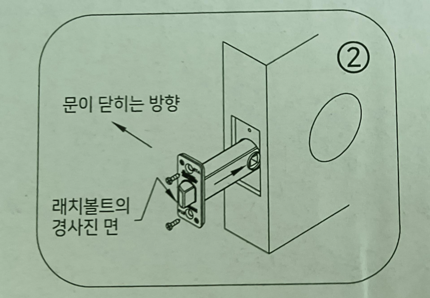 래치를 문 닫힘 방향에 맞춰 삽입시킵니다. 래치 피스로 체결합니다. 래치는 닫힌 문을 열리지 않게 도와주는 장치입니다. 둥근 면이 바깥쪽 방향이어야 합니다.