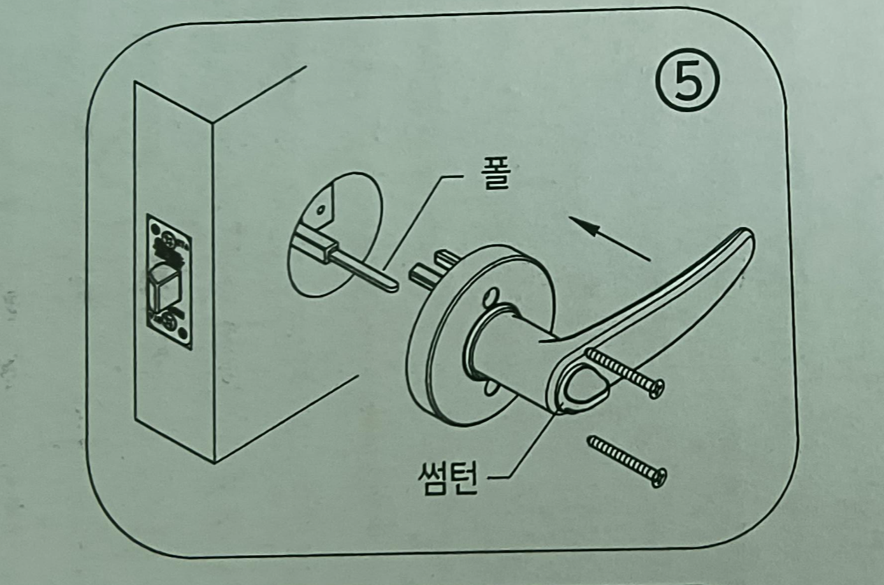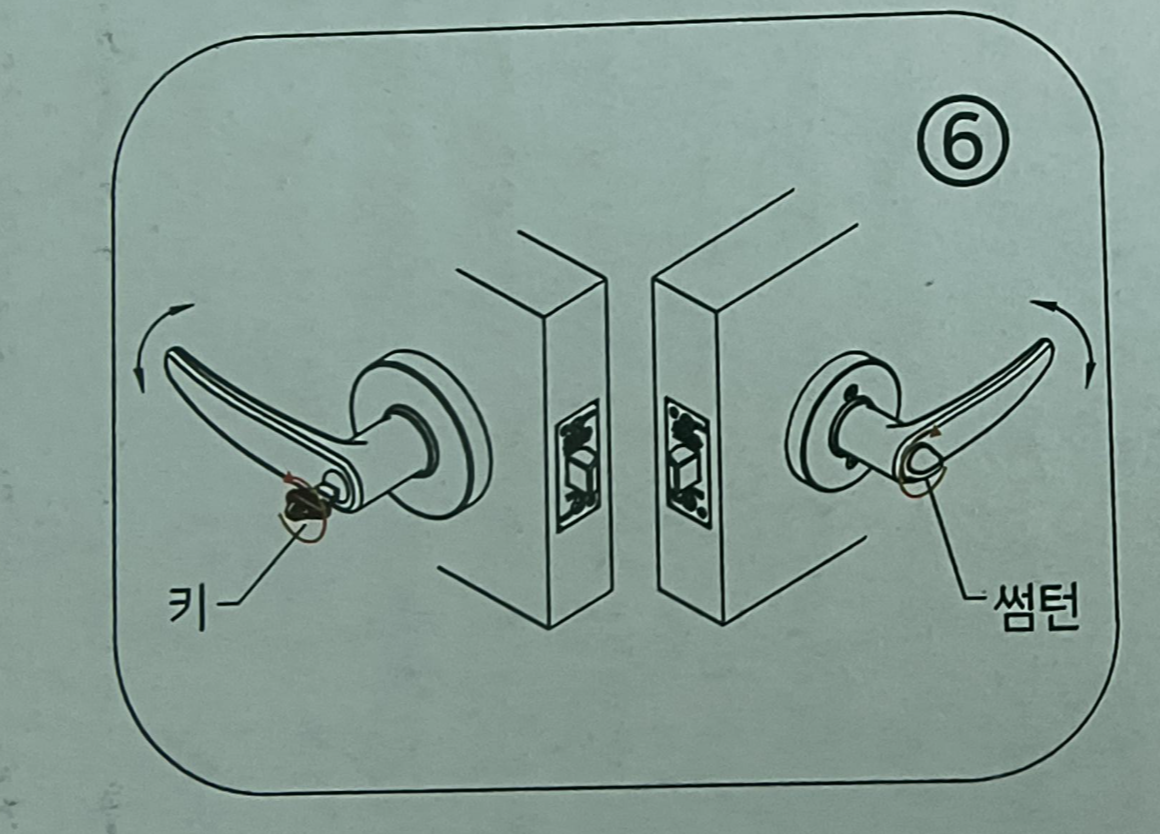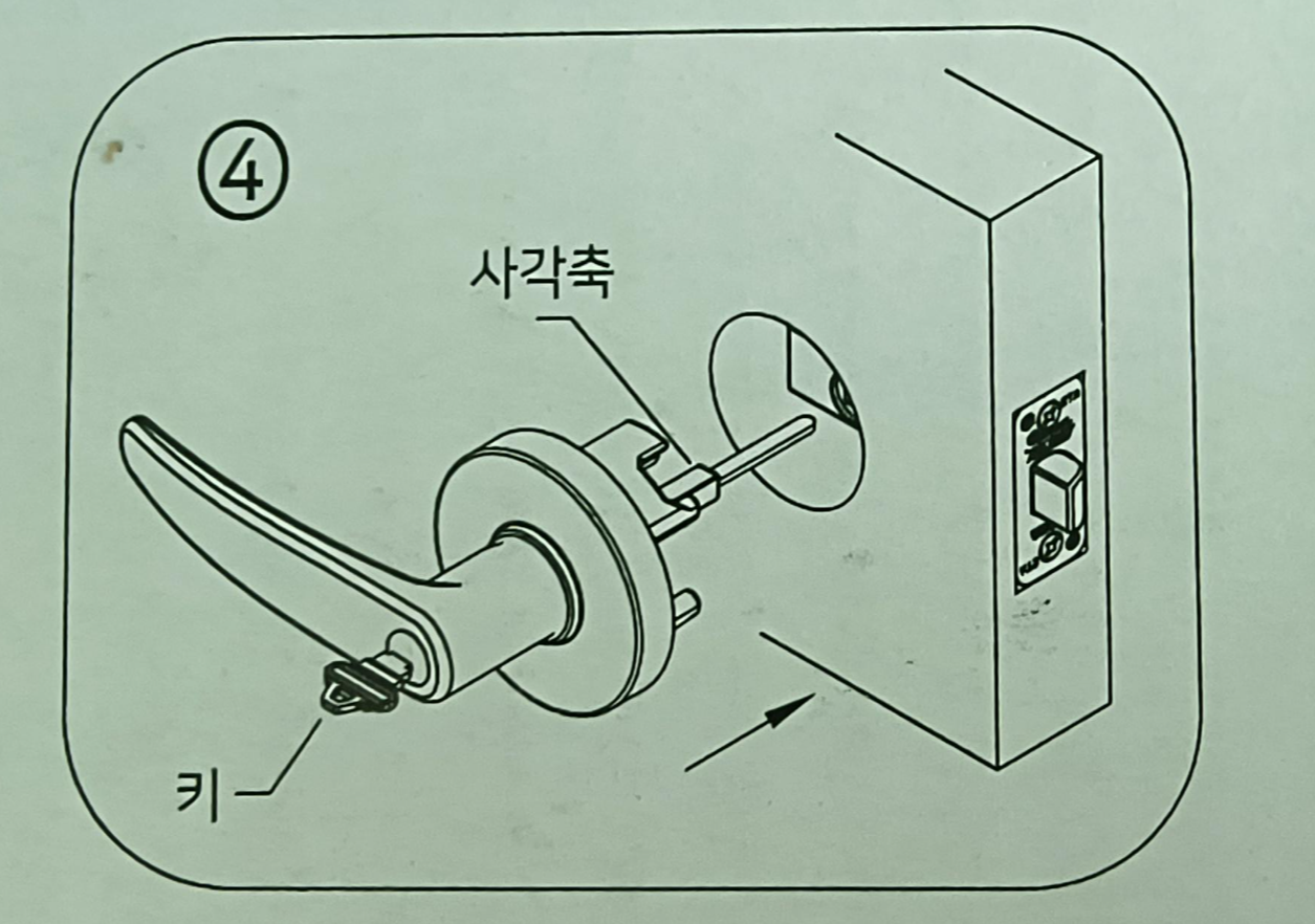 가체결된 피스를 완전 고정시킵니다. 문이 열린 상태에서 안쪽, 바깥쪽 손잡이를 움직여 작동시킵니다. 손잡이 움직임과 래치 상태를 점검합니다.