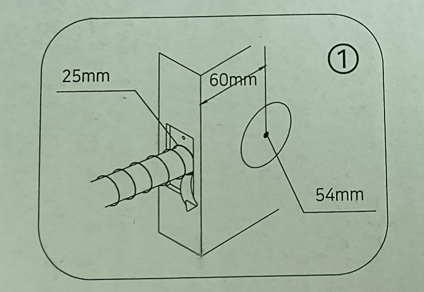 위 그림과 같이 문에 취부 구멍 25mm와 54mm를 뚫습니다. 54mm 구멍은 래치에서 60mm 떨어져 있습니다.