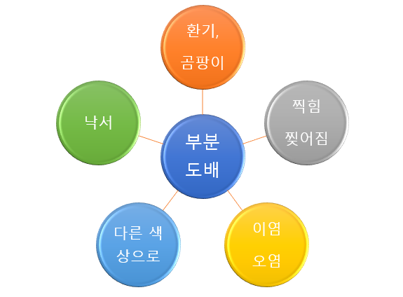 전체 도배를 했는데도 불구하고 벽면에 상태나 사용 환경에 따라 벽지의 수명을 다하는 경우가 있습니다. 가구의 배치나 환기의 문제로 생기는 벽지 곰팡이, 사용 중에 생긴 찍힘, 찢어짐, 오염, 이염등으로 벽지면에 이상이 생겼을 때에는 그 부분만 새 벽지로 도배를 하는 것입니다. 기존의 벽지의 자투리가 있다면 그것으로, 없다면 포인트를 준다는 의미에서도 다른 색상으로 해도 괜찮습니다.