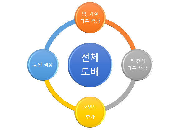전체도배는 벽과 천장을 따로따로, 방마다, 거실마다 따로따로 할 수도 있습니다. 각 주거공간마다 선택의 폭이 넓힐 수 있습니다. 약간의 비용 상승을 제외하며 각 주거공간의 특색과 개성을 살릴 수도 있습니다. 게다가 각 주거공간마다 한 면이상의 포인트를 줄 수도 있습니다.