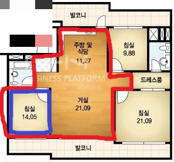 1. 도배 견적 (빨간색 테두리: 거실, 주방, 현관, 작은방, 천고 2.4m)
