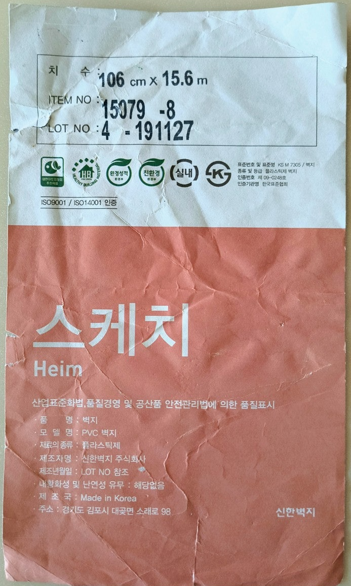 벽지 뒷면에는 라벨이 붙어 있지 않습니다. 따라서 시공 당시 남은 제품 라벨지를 따로 보관하는 것이 가장 확실합니다. 라벨에는 제조사명, 제품명, 모델번호가 적혀 있어 동일 벽지를 찾는 핵심 정보가 됩니다.