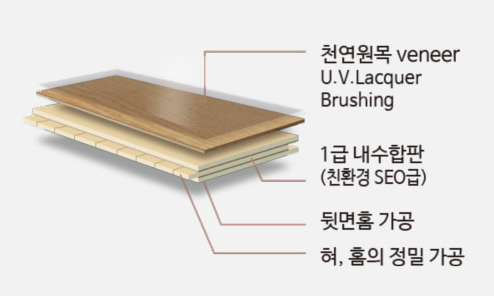 - 표면층이 천연목이기에 마루의 패턴과 색상이 고급스러우며 자연스럽습니다.