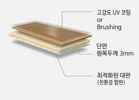 - 표면층이 천연목이기에 마루의 패턴과 색상이 고급스러우며 자연스럽습니다.