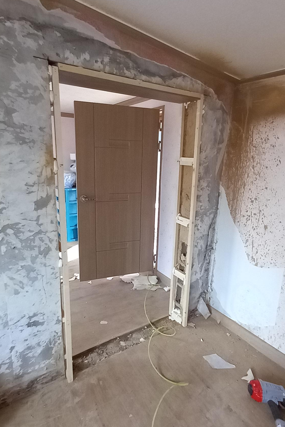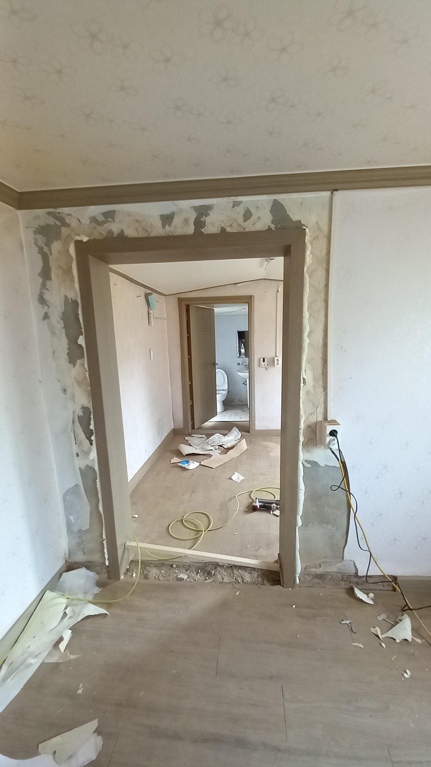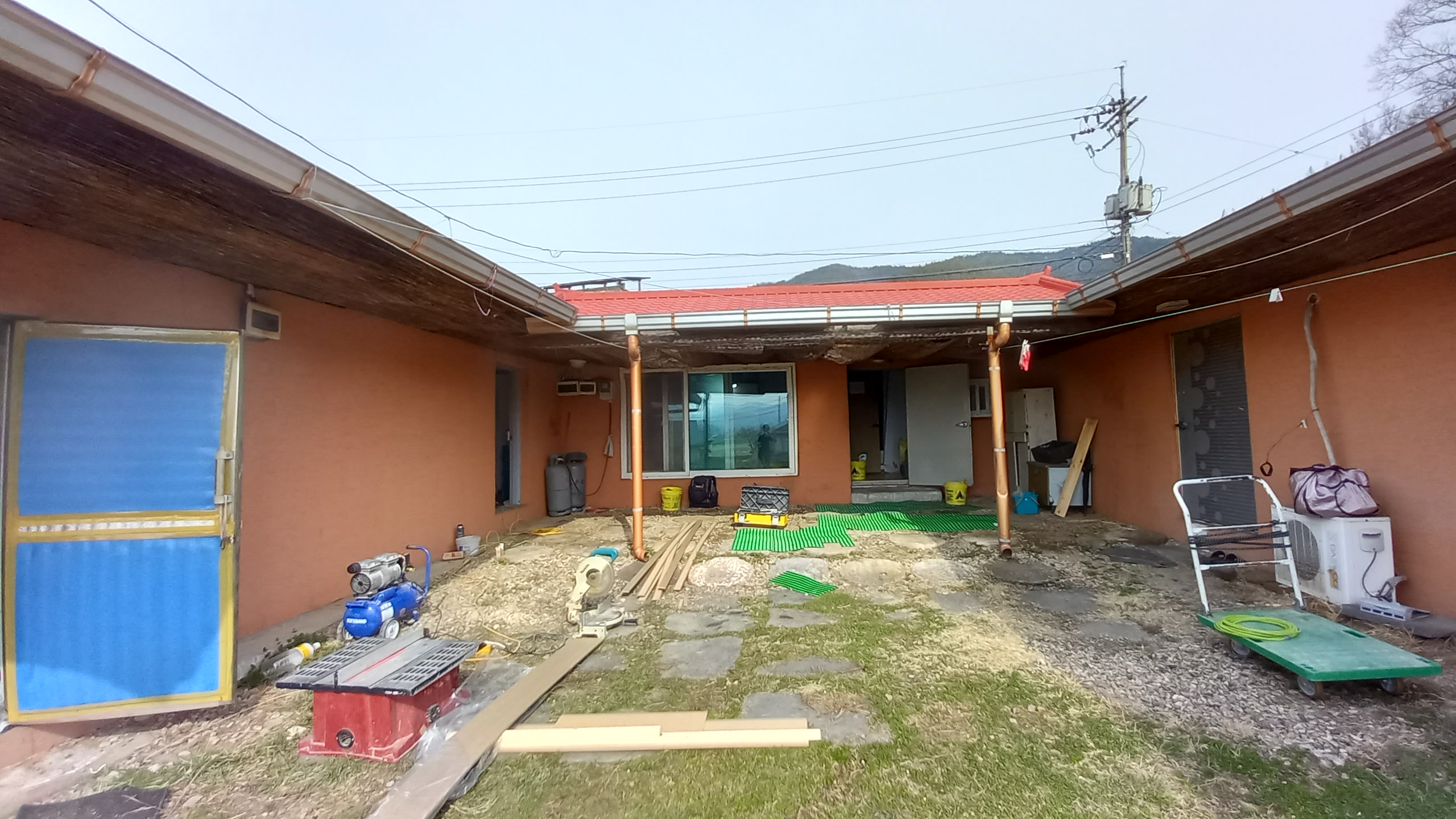 안채의 주방 싱크대를 철거하며 일부를 사랑채의 화장실 겸 보일러실로 옮긴다. 또한 안채의 주방 싱크대는 신규로 설치한다. 사랑채의 화장실 겸 보일러실에 싱크대용 100 파이 넘는 배기 구멍을 뚫는 작업도 진행한다. 사랑채 방 두 개에 통로를 만들기 위해 맞주하는 벽을 잘라낸 상태이며 목공작업으로 마무리도 해야 한다. 걸레받이도 물먹은 상태라서 재활용이 거의 불가능하다. 그리고 안채와 사랑채 전체 도배를 한다. 시골집 도배는 대부분 밀착도배를 한다. 시골집 도배를 잘하는 것은 잘 붙이는 것이다. 미적인 것과는 별 관계가 없는 듯하다. 시골에서 구축 상태가 오래된 집을 시골집이라고 표현한다. 면과 각이 안 맞는 것이 대부분이라 여건에 따라서 붙이면 되는 것이 팁이다.