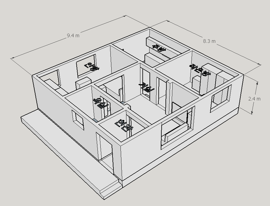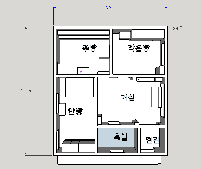 말로 설명하는 집구조는 한계가 있습니다. 상상으로 만들어 내는 것은 읽는 사람마다 다르기 때문에 집구조 레이아웃이 필요한 이유입니다. 집 내부만 수리를 하는 것이기 때문에 외부는 중요하지 않아 배제했습니다. 스케치업으로 작업을 했으며, 그날 작업한 내용을 복기하면서 작성하기 때문에 3시간 넘는 작업을 합니다. 정확한 실측보다는 주변 상황으로 추측해서 길이와 폭을 대략적으로 산출합니다. 완성 후에는 작업 현장과 거의 비슷하다는 느낌을 받습니다.
