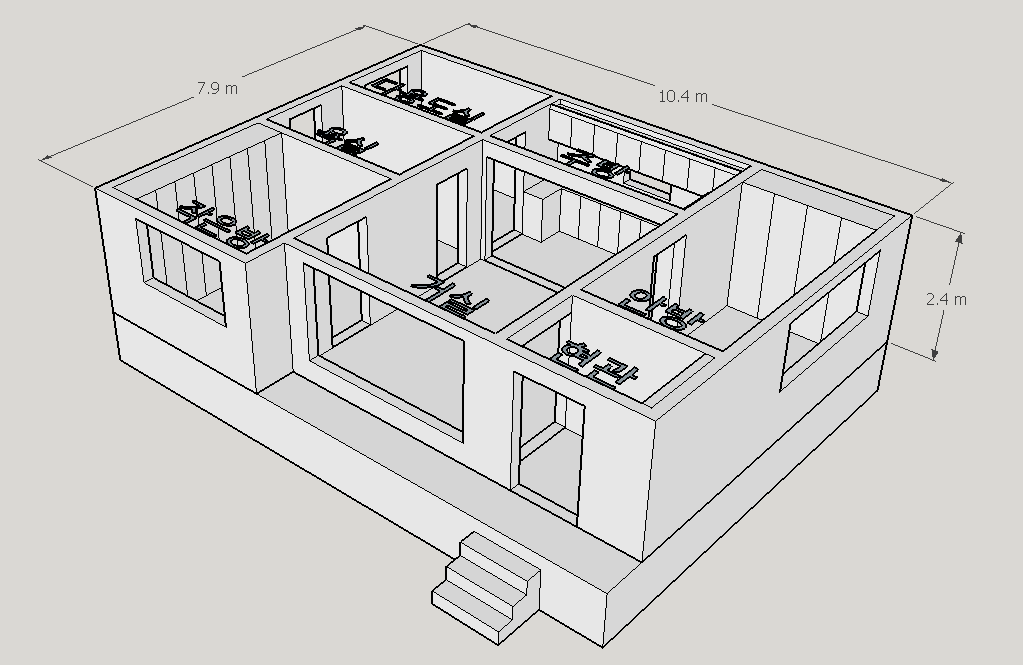 현관문을 열고 들어가면 오른쪽에 신발장이 있으며, 왼쪽에 중문을 열고 거실로 들어갑니다. 여느 집과 같이 거실에는 소파, 에어컨, TV 등이 있습니다. 오른쪽으론 안방이 있으며 그 옆에 주방과 다용도실이 있습니다. 중문 맞은편에도 작은방이 하나 있고 그 옆에는 욕실도 있습니다. 방은 2개, 주방, 다용도실, 거실, 욕실등이 있는 일반 개인주택입니다.