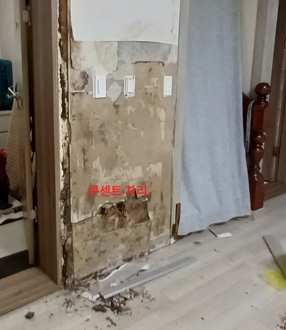 이 현장은 벽지가 습기에 의해 변색의 과정을 지나 변형 및 탈착이 일어난 상태입니다. 그 상태로 오랫동안 방치하여 전이가 많이 되었습니다. 거실의 문선 몰딩과 걸레받이 그리고 방의 문선과 걸레받이가 썩어, 필름만 앙상히 남아있었습니다. 습기로 인해 손상된 마감재를 모두 교체해야 합니다. 먼저, 벽지를 제거한 후 손상 여부를 들여다보았습니다. 겉으로 드러난 손상 정도보다 심각했습니다. 석고보드가 물을 먹은 지는 오래되어, 건들기만 해도 떨어져 나갑니다. 석고보드 안쪽의 루바도 썩은 곳이 많이 보였지만, 심각하게 손상된 석고보드 일부만 재단해서 교체하기로 했습니다. 기존에 제거했던 콘센트도 부활시키기도 했습니다. AC 220V 전압도 정상적이었습니다.