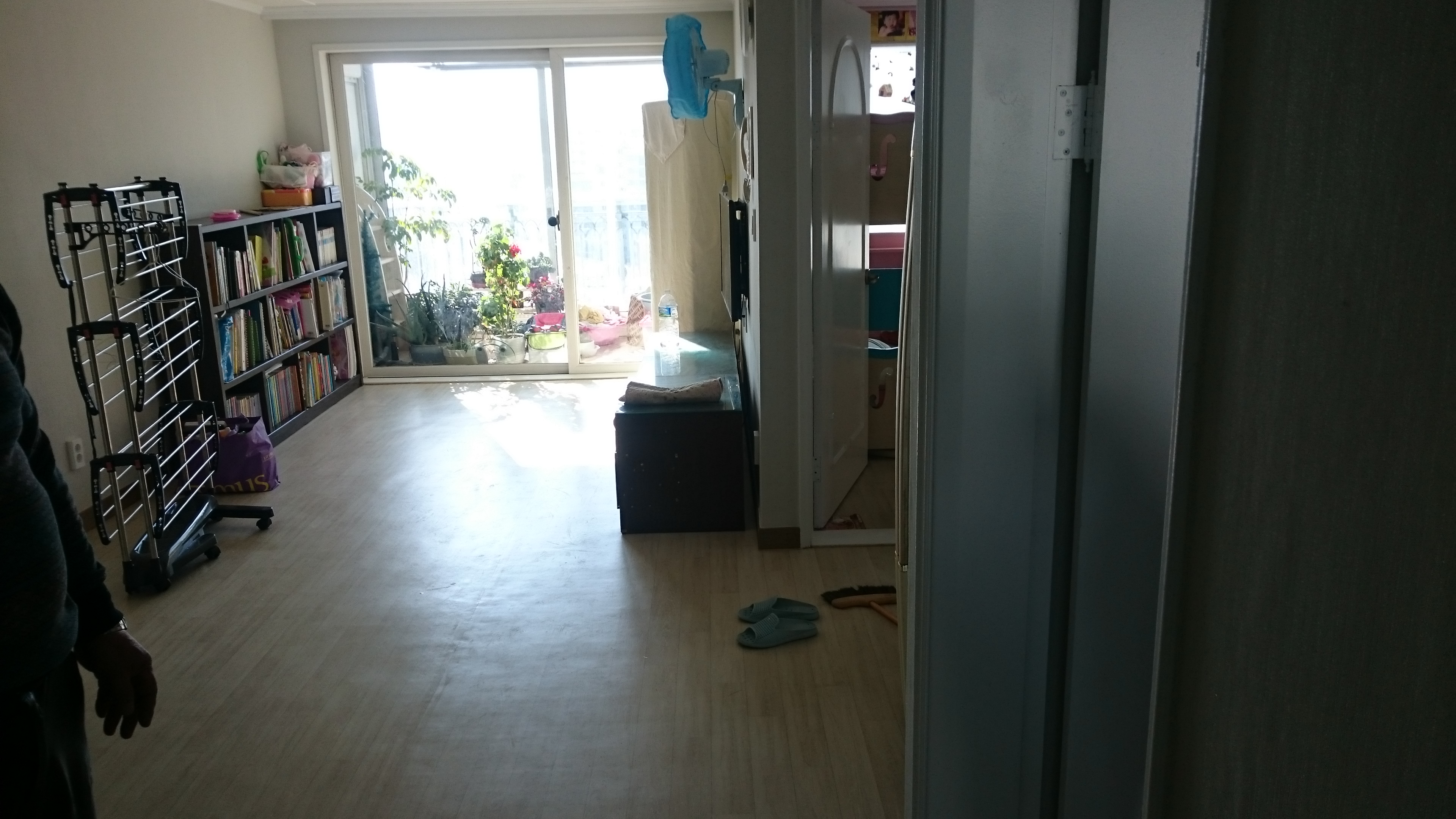 거실과 주방, 안방, 작은방으로 구성이 됩니다. 식사, TV 시청 등 공동생활을 할 수 있는 거실과 주방이 있고, 안방은 부모와 자녀, 작은방에는 친정부모가 생활을 하고 있습니다. 복도식 아파트의 양 끝 처음과 마지막 호수는 현관문 앞의 공간을 사용할 수 있게 되어있습니다. 거실은 책장, TV, 테이블이 있고, 주방에는 냉장고, 식탁이 있습니다. 앞베란다는 화분으로 가득하고, 현관에는 신발장이 부족할 정도입니다. 안방은 장롱, 화장대, 2층 침대, 작은방에는 친정부모의 짐이 있네요.