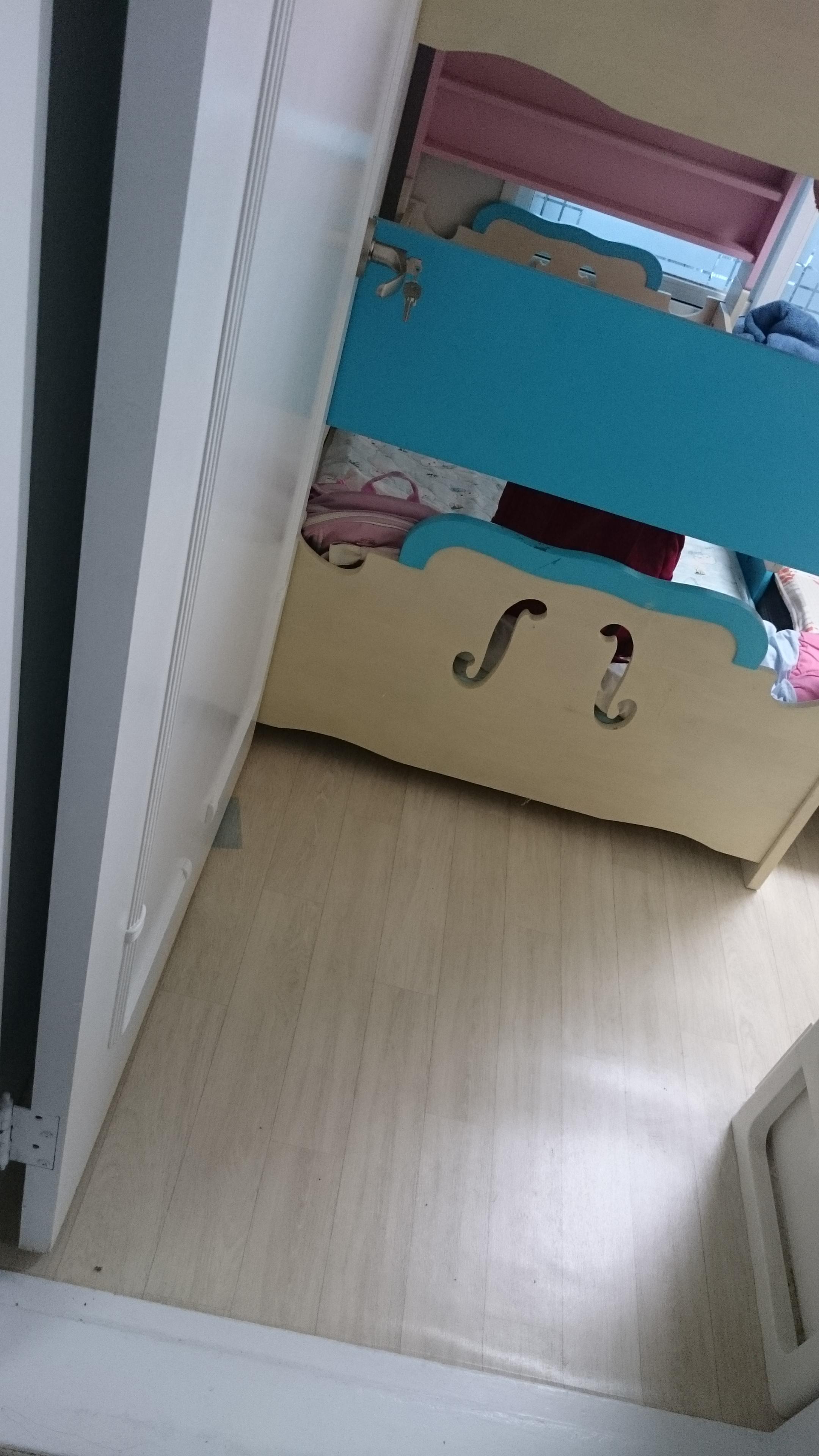 같은 방법으로 안방을 해야 하는데 여기는 장롱, 화장대, 2층 침대가 있습니다. 2층 침대는 분리하고요, 장롱은 분리해 놓습니다. 높이가 높아 전등과 닿을 수 있으니 전등 제거부터 해야 합니다. 실무를 할 시간보다 짐 옮기는 시간이 더 들어가고, 힘을 더 사용해야 합니다. 기존 벽지 제거, 고급 도배 기초, 정배, 장판시공 순으로 시공을 합니다. 장판시공은 최소 한 폭을 깔 수 있는 공간을 확보해야 합니다.
