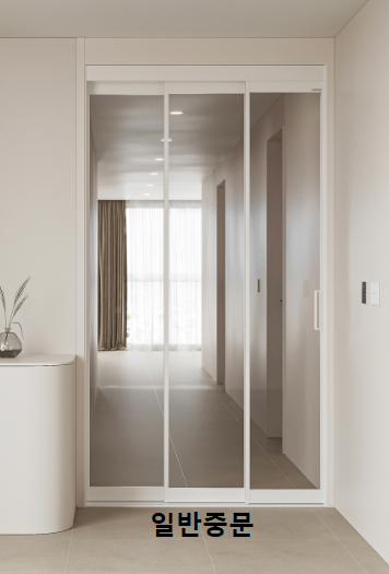 보통 중문의 1/3 ~ 1/4 정도를 막아주는 디자인이 일반적입니다. 3 연동 중문뿐만 아니라, 여닫이 문에도 고시를 선택할 수 있습니다. 고시형 오픈 여닫이 문은 하단 공간을 막아주어 사생활이 보호와 현관 바닥 노출을 막아주는 효과가 있습니다.