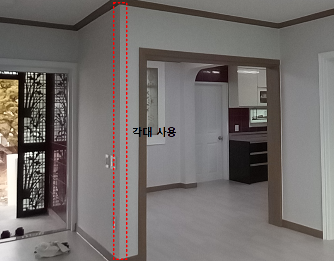 도배, 바닥재을 작업을 할 때 쓰는 용어 1. 걸레받이 : 목공, 장판 - 방바닥과 벽이 만나는 모서리 부분의 마감으로 목공 또는 장판으로 마감을 하는 경우가 있습니다. 목공으로 마감할 경우는 바