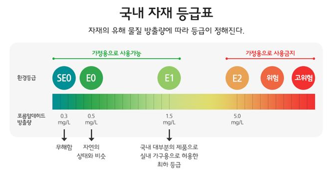 SE0 (Super E0) 등급에 가까운 자재일수록 포름알데히드의 방출량이 적어 유해성이 약해집니다. E1등급 제품은 E0등급 제품보다 최대 3 ~ 5배의 차이를 보이고 있습니다. 우리나라의 실내 가구로 사용 가능한 최소 등급은 E1입니다. 미국, 일본, 유럽연합 같은 나라에서는 E0등급이 실내 가구에 사용할 수 있는 최소한의 등급이라고 합니다. 밀폐된 실내공간에서 높은 등급의 가공 목재에서 방출되는 포름알데히드는 치명적일 수 있기 때문입니다.