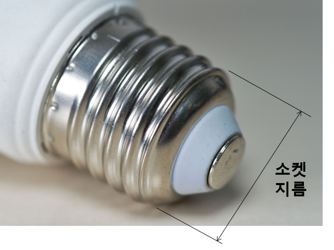 전구는 베이스 직경으로 구분을 하며, 우리나라 전구에는 4종류의 소켓이 주를 이룹니다. E14, E17, E26, E39입니다. 알파벳 E를 뺀 나머지 숫자가 소켓지름을 나타냅니다. 14는 14 mm을, 17은 17 mm을, 39는 39mm을 의미합니다. 육안으로 E26과 E39는 구별이 쉽지만, E14와 E17의 단독 구별은 어렵습니다. 자, 줄자, 버니캘리퍼스 등의 측정 도구를 이용해 구별합니다.