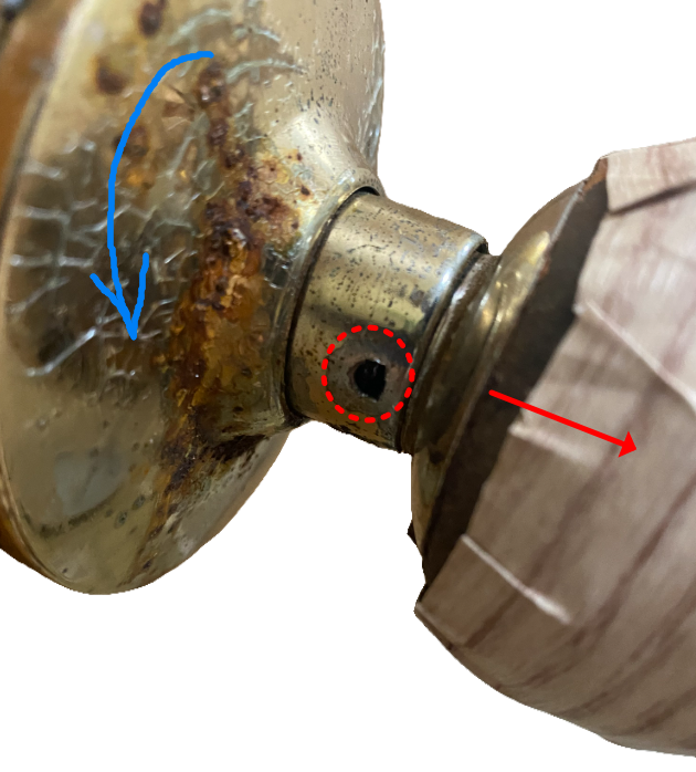 - 방문 안쪽 (잠금장치가 있는 쪽) 손잡이 목 부분을 자세히 보세요. 작은 나사 구멍이나 눌러지는 핀 같은 것이 있을 수 있습니다.