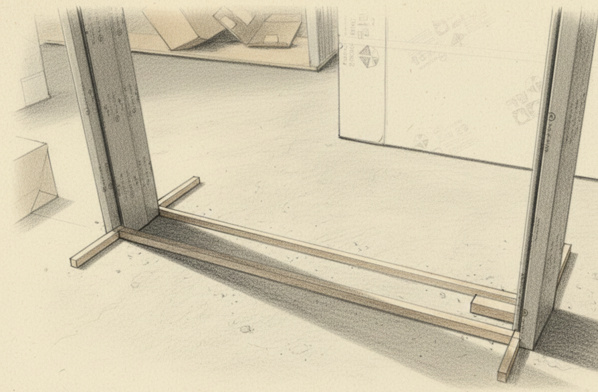 문지방 없는 문틀을 설치하는 가장 좋은 방법은 임시 문지방을 만드는 것이지만, 그럴 수 없는 상황이라면 문틀 내경 사이즈에 맞게 나무를 재단해서 가이드로 사용하는 방법도 있습니다. 문틀의 왼쪽을 고정하고 가이드를 끼워준 후, 문틀의 오른쪽에 쐐기를 고정하면 문틀 내경이 유지되면서 시공하기 좋은 상태가 됩니다.