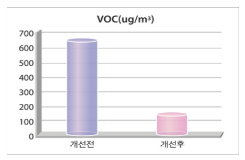 과연 친환경 실내 건축자재의 공기질 개선 효과는 2019년 2월 발행한 환경부에서 《실내공기 제대로 알기 100문 100답》에서 그 답을 찾을 수 있습니다. 어린이집 실내를 HB마크 최우수등급 친환경 건축자재로 교체 후 실내 오염물질 농도변화 확연히 줄어준 결과를 아래의 그래프로 확인할 수 있습니다.