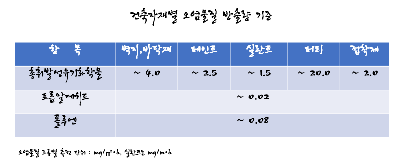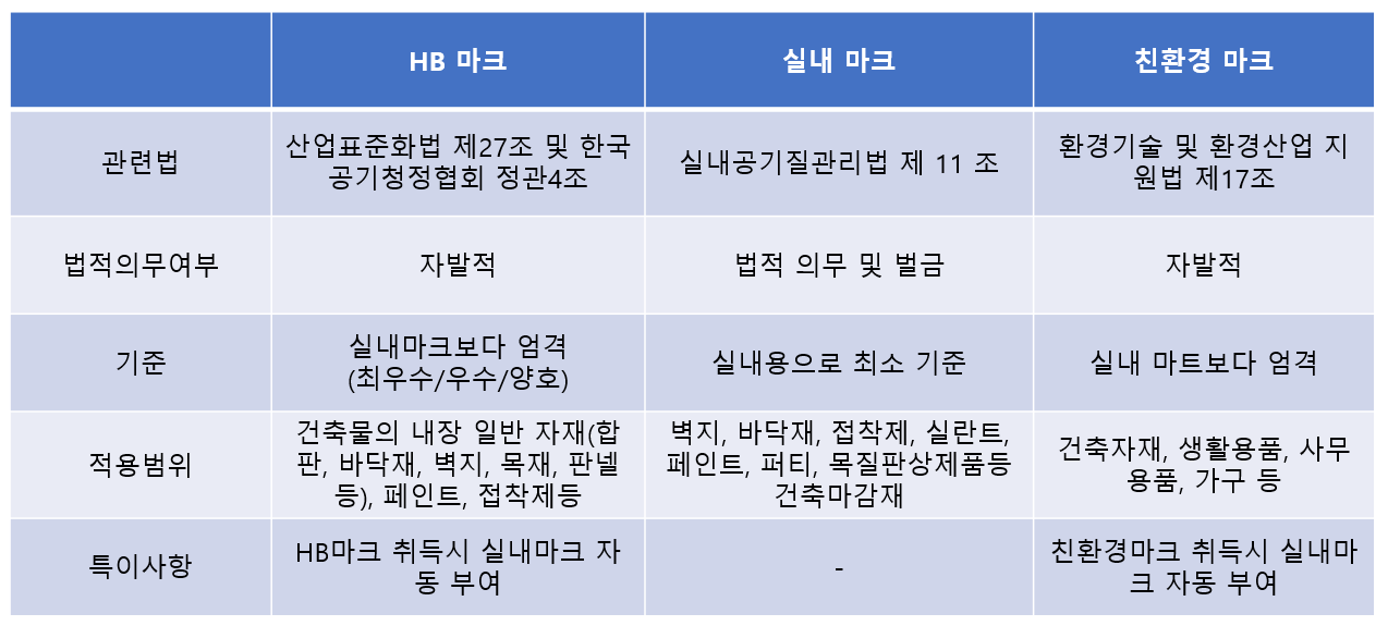마감을 대표하는 실내 건축자재의 오염물질 방출량 기준을 각 인증마크별 정리하면 보다 더 명확해집니다.