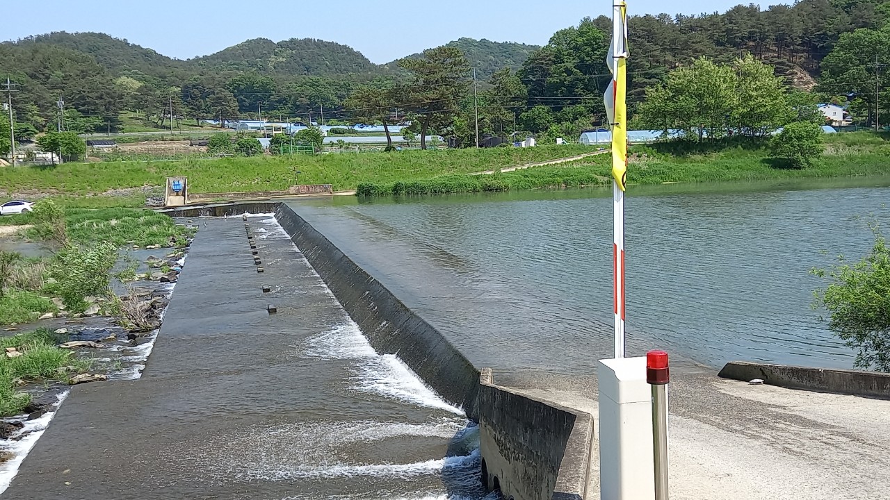 어끄제 온 비로 인해 보에 물이 넘치고 있습니다.