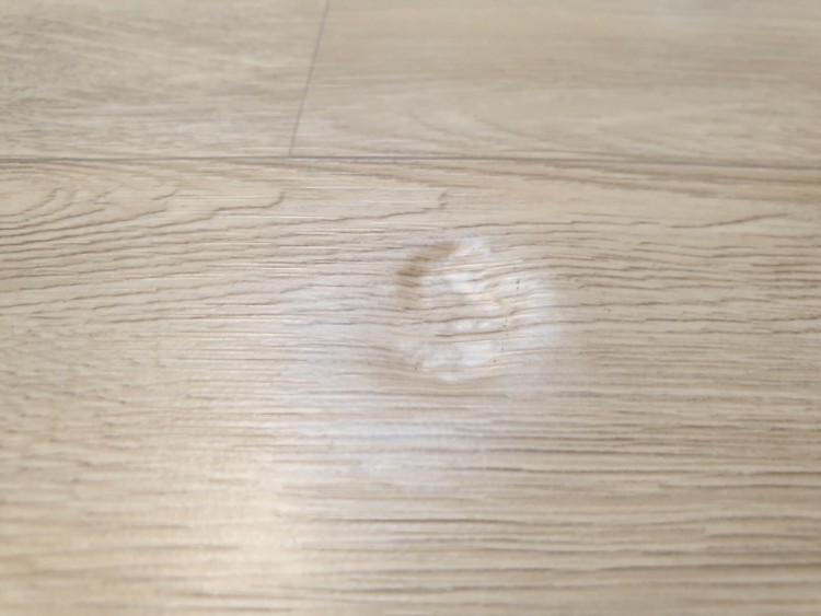 뽀쪽한 물체가 바닥에 떨어져 생긴 손상이다. 손상 크기는 작지만 그 깊이가 장판 속까지 들어간다. 장판 겉면까지 손상을 입었지만 장판 겉면이 떨어져 나가지는 않은 상태이다. 먼저 눌림 현상 복원 방법으로 장판 주변의 온도를 올려주는 것이 준비 과정이다.