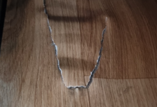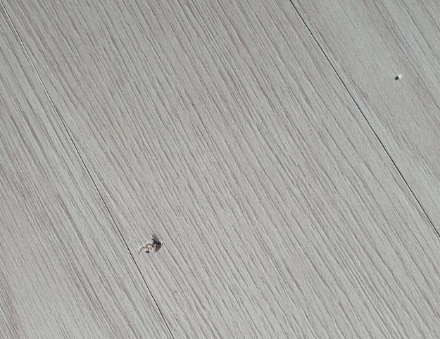 뽀쪽한 물체가 바닥에 떨어져 생긴 손상이다. 손상 크기는 작지만 그 깊이가 장판 속까지 들어간다. 장판 겉면까지 손상을 입었지만 장판 겉면이 떨어져 나가지는 않은 상태이다. 먼저 눌림 현상 복원 방법으로 장판 주변의 온도를 올려주는 것이 준비 과정이다.