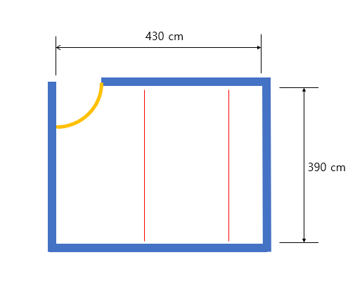 이 공간의 가로[폭]은 430센티미터로 3폭 시공해야 합니다. 430을 180으로 나누면 2.39입니다. 2폭으로 부족합니다. 즉 나머지는 무조건 올림처리해야 합니다. 따라서 필요한 장판 길이는 400 ~ 410센티미터 x 3 폭입니다. 1,200 ~ 1,230센티미터입니다. 12 ~ 12.3미터입니다.